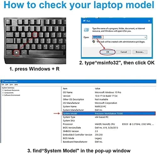 1. Tienes que encontrar el modelo específico de tu portátil antes de pedir una batería correcta. ¿Cómo verificar el modelo de su computadora portátil? (1. Presione Windows + R 2. Escriba «msinfo32», luego haga clic en Aceptar 3. Busque «Modelo del sistema» en la ventana emergente)